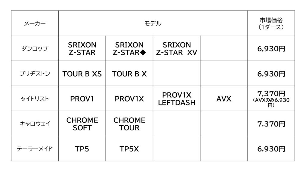 各メーカーとも、2つ以上のタイプをラインナップしています。ゴルフクラブと同様に、ゴルフボールのジャンルでも多様化がスタンダードになっていますので、スピン系というカテゴリーの中だけでも個性に合わせたタイプを選べるようになっています。